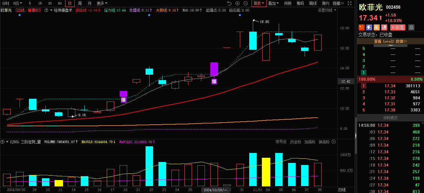 欧菲光-经伟操盘术指标-出现爆点信号和红色线