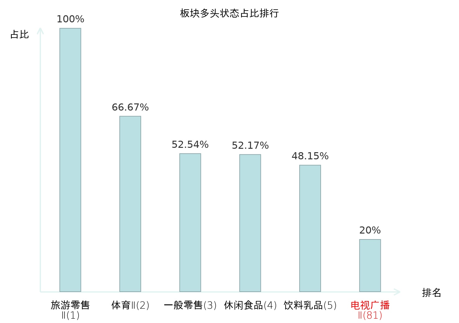 全市场所有行业板块中主力多头状态占比排名中,旅游零售Ⅱ板块位居第一。农业综合Ⅱ板块名次提升最快,较昨日上升109位。