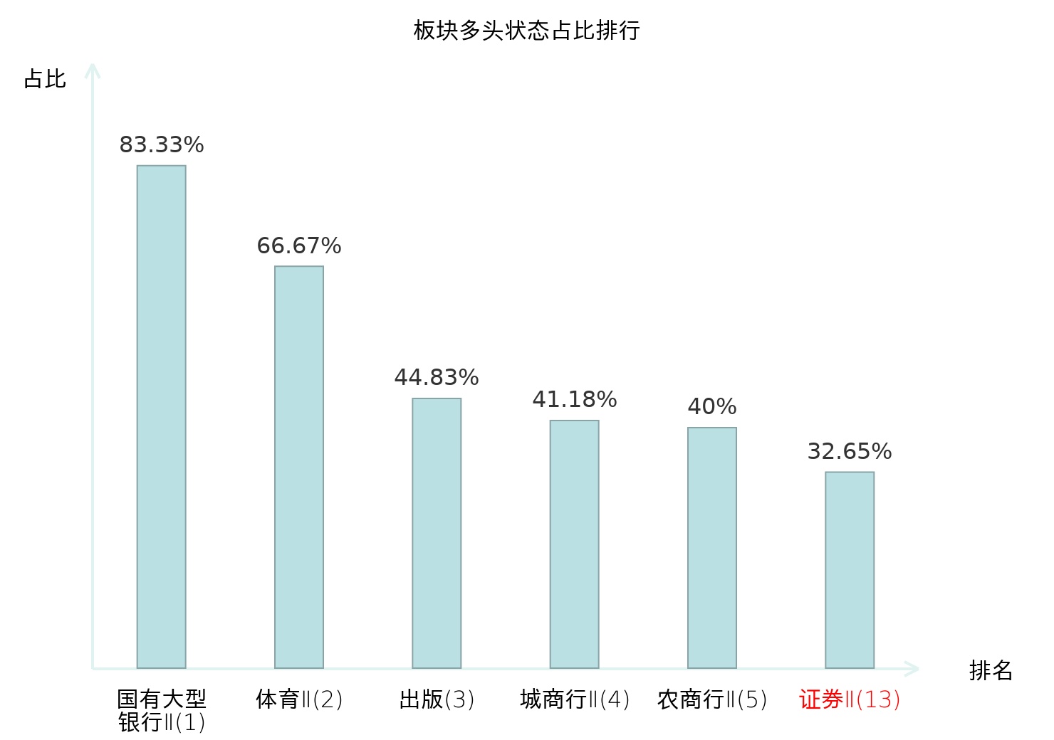 全市场所有行业板块中主力多头状态占比排名中,国有大型银行Ⅱ板块位居第一。焦炭Ⅱ板块名次提升最快,较昨日上升35位。