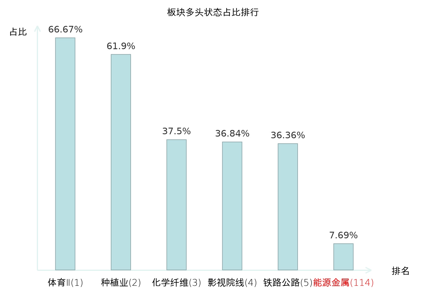 全市场所有行业板块中主力多头状态占比排名中,体育Ⅱ板块位居第一。种植业板块名次提升最快,较昨日上升65位。