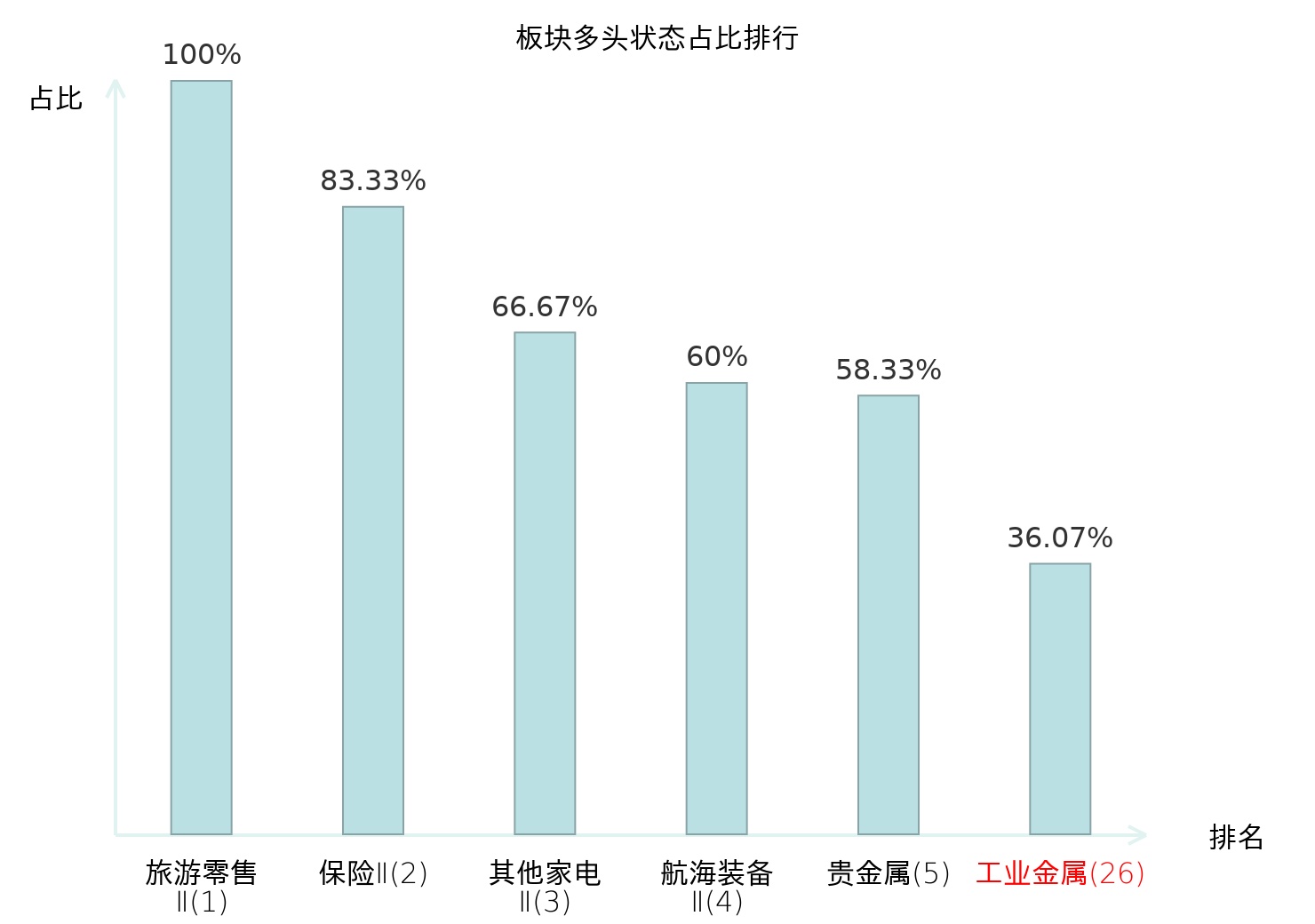 全市场所有行业板块中主力多头状态占比排名中,旅游零售Ⅱ板块位居第一。综合Ⅱ板块名次提升最快,较昨日上升69位。