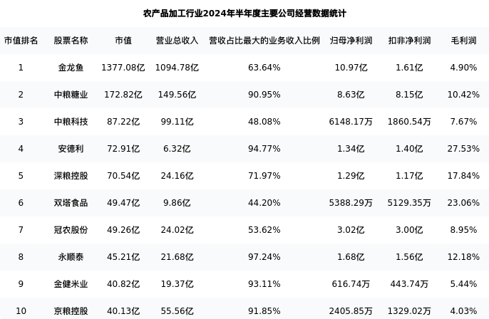 京粮控股最新报告期数据为半年度,下表汇总了农产品加工行业内市值靠前的公司半年度主要经营数据