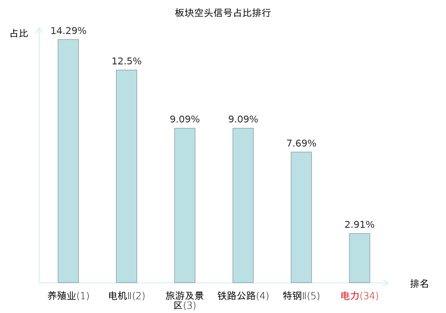 全市场所有行业板块中主力空头信号占比排名中,养殖业板块位居第一。电机Ⅱ板块名次提升最快,较昨日上升118位。