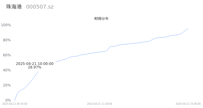 000507珠海港2025年04月21日成交34.20万手,成交金额1.83亿,相较昨日缩量4.83万手,换手率3.79%,成交清淡。
