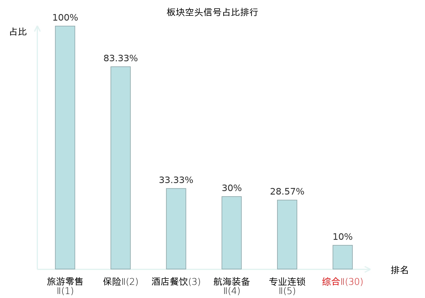 全市场所有行业板块中主力空头信号占比排名中,旅游零售Ⅱ板块位居第一。风电设备板块名次提升最快,较昨日上升101位。