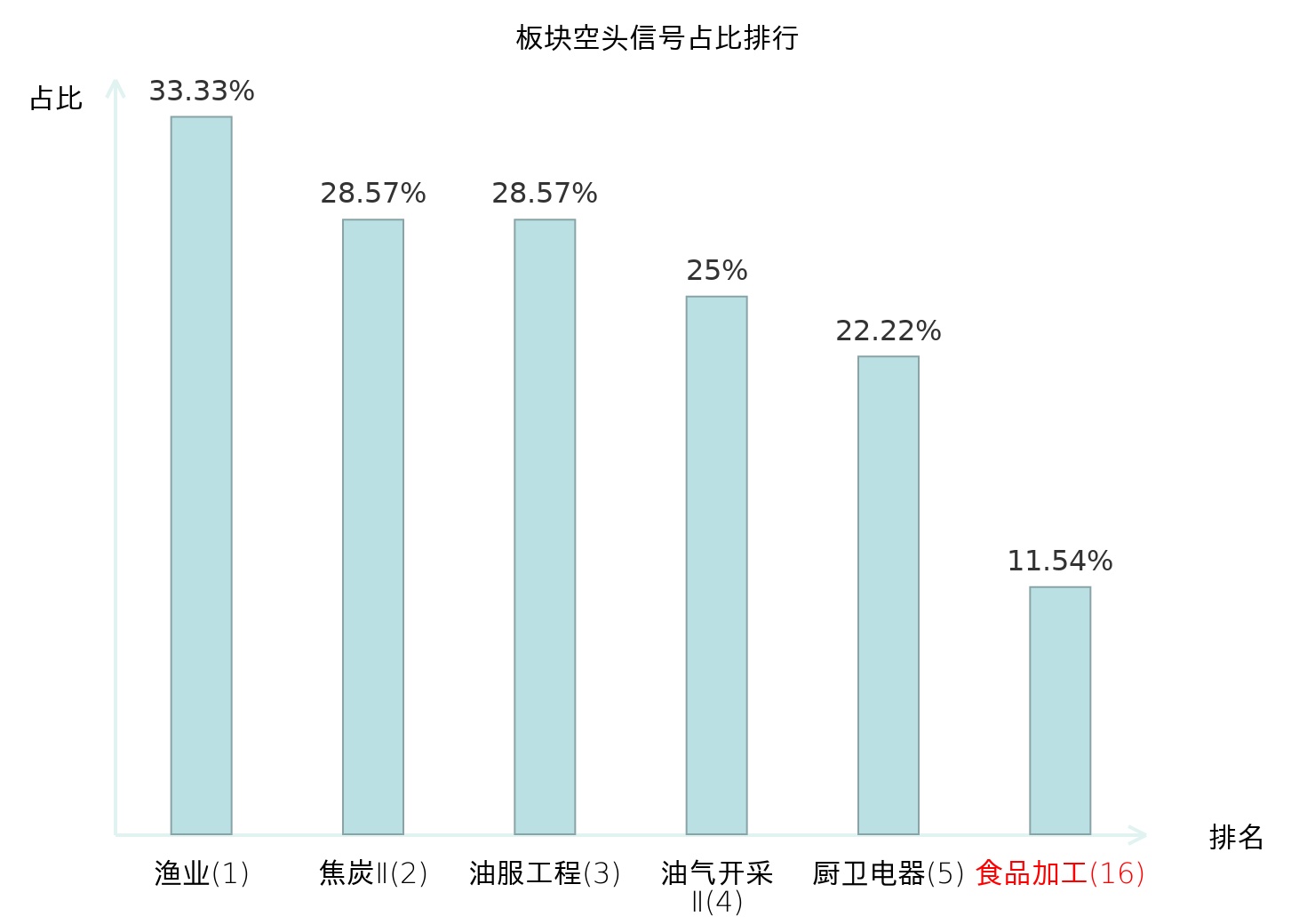 全市场所有行业板块中主力空头信号占比排名中,渔业板块位居第一。农产品加工板块名次提升最快,较昨日上升112位。