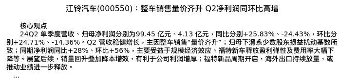 值得注意的是:2024年09月中信建投证券的陶亦然/程似骐/李粵皖分析师,首次发布关于江铃汽车的研究报告,标题为:江铃汽车(000550):整车销售量价齐升 Q2净利润同环比高增。