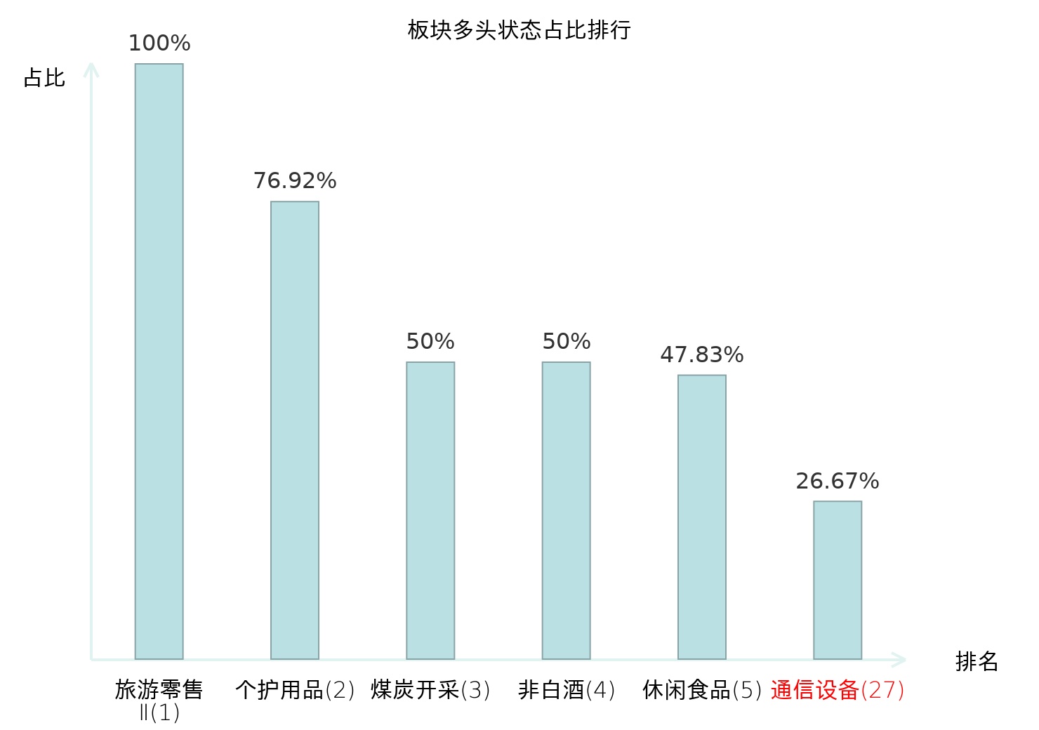 全市场所有行业板块中主力多头状态占比排名中,旅游零售Ⅱ板块位居第一。贸易Ⅱ板块名次提升最快,较昨日上升61位。