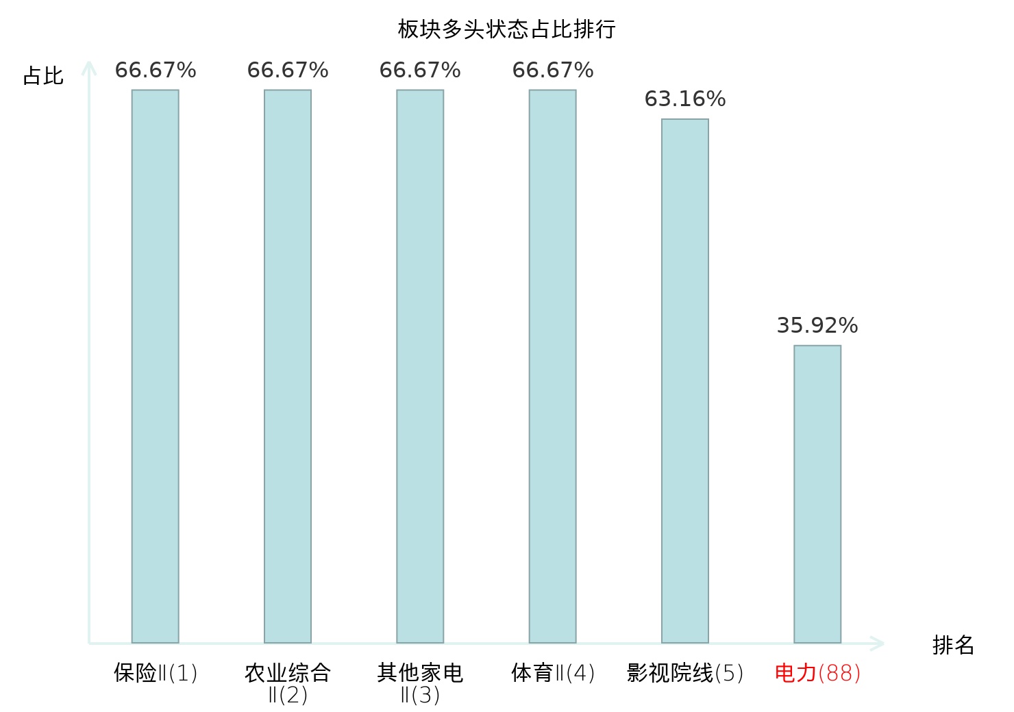 全市场所有行业板块中主力多头状态占比排名中,保险Ⅱ板块位居第一。冶钢原料板块名次提升最快,较昨日上升53位。