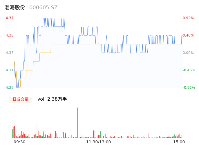 09月09日,渤海股份收报4.35,股价涨幅0.46%,成交金额1031.74万,换手率0.71%。