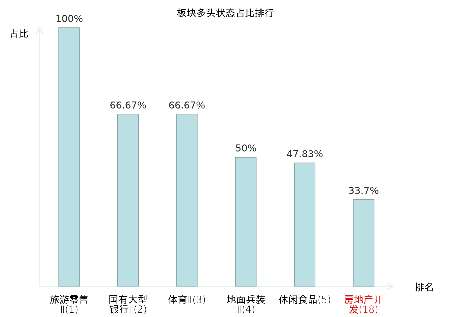 全市场所有行业板块中主力多头状态占比排名中,旅游零售Ⅱ板块位居第一。航空机场板块名次提升最快,较昨日上升80位。