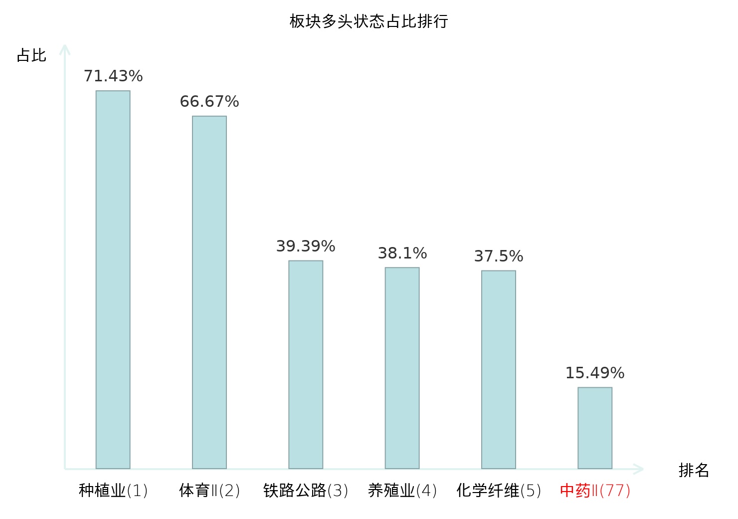 全市场所有行业板块中主力多头状态占比排名中,种植业板块位居第一。养殖业板块名次提升最快,较昨日上升99位。