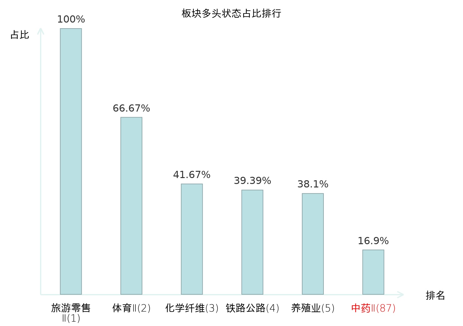 全市场所有行业板块中主力多头状态占比排名中,旅游零售Ⅱ板块位居第一。旅游零售Ⅱ板块名次提升最快,较昨日上升130位。