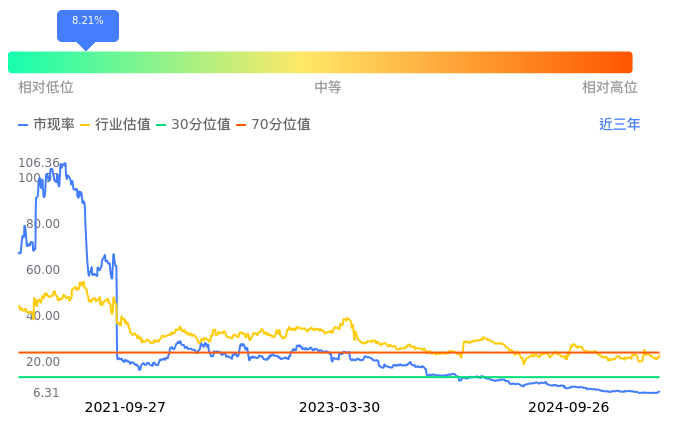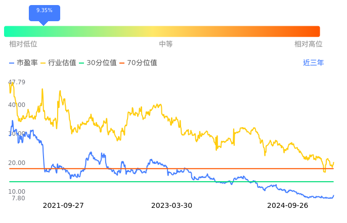 2024年09月26日,长春高新上涨7.34%收于90.82,今日成交金额9.89亿。下文将从市盈率PETTM、市净率PB、市现率3个角度去分析公司估值情况。