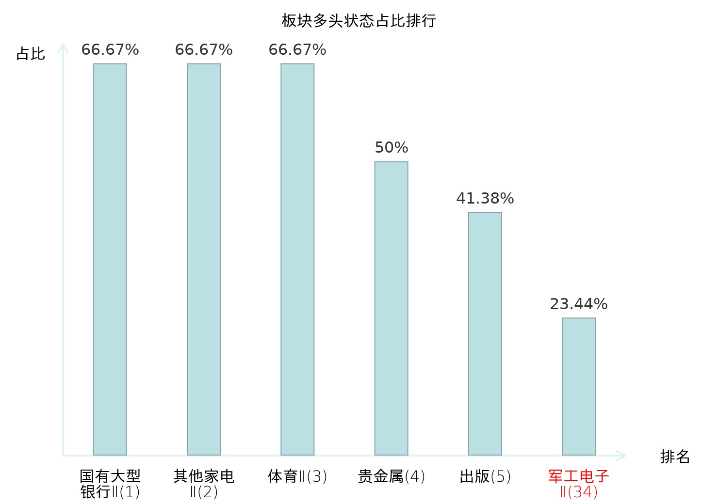 全市场所有行业板块中主力多头状态占比排名中,国有大型银行Ⅱ板块位居第一。林业Ⅱ板块名次提升最快,较昨日上升96位。