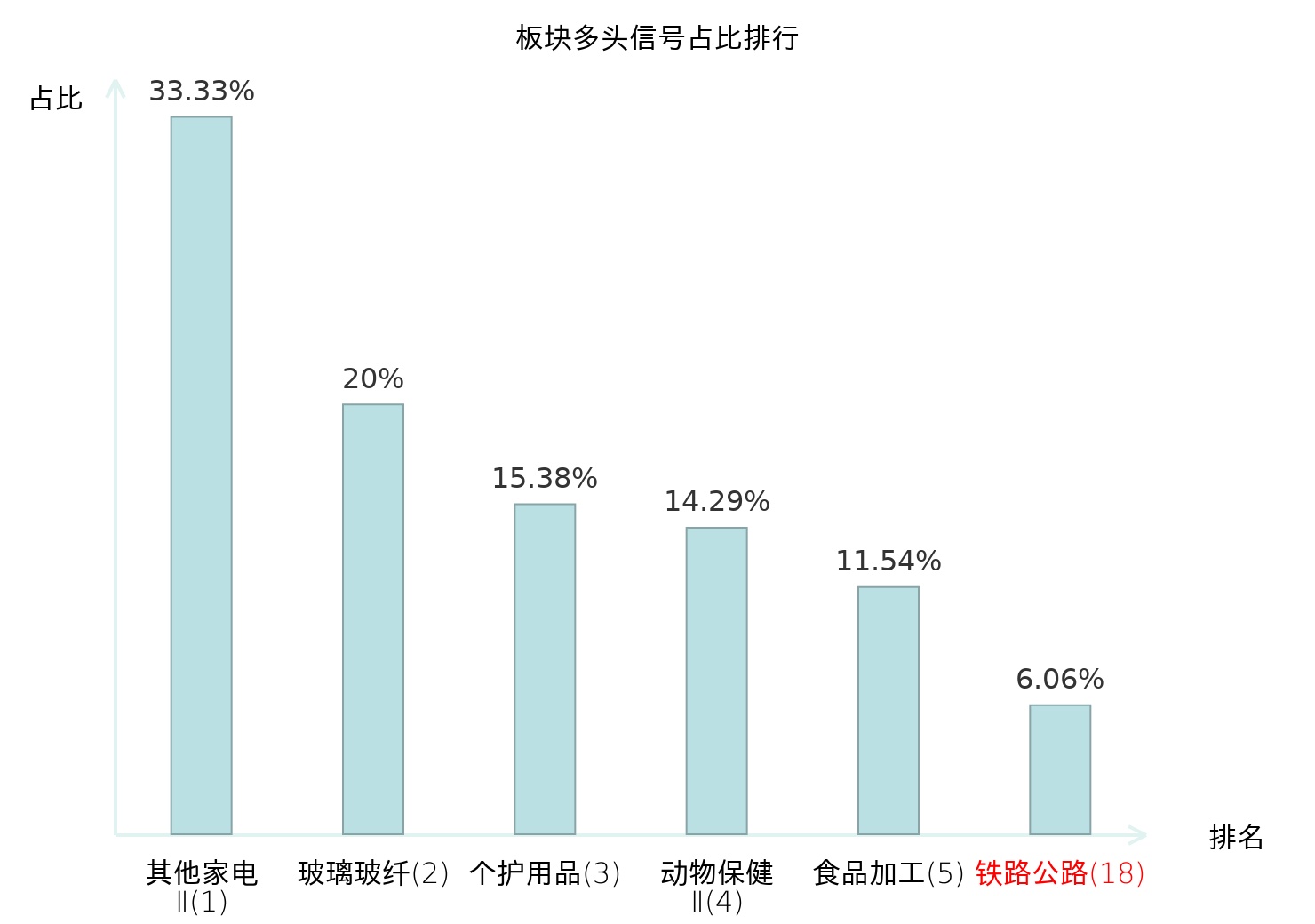 全市场所有行业板块中主力多头信号占比排名中,其他家电Ⅱ板块位居第一。其他家电Ⅱ板块名次提升最快,较昨日上升128位。