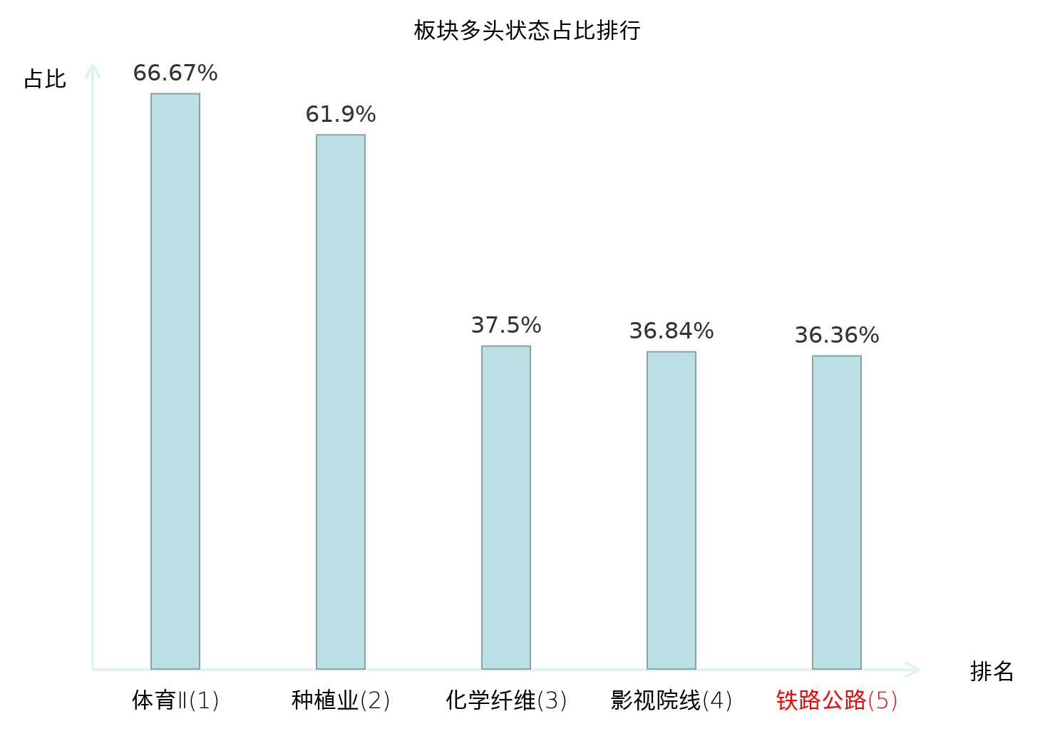 全市场所有行业板块中主力多头状态占比排名中,体育Ⅱ板块位居第一。种植业板块名次提升最快,较昨日上升65位。