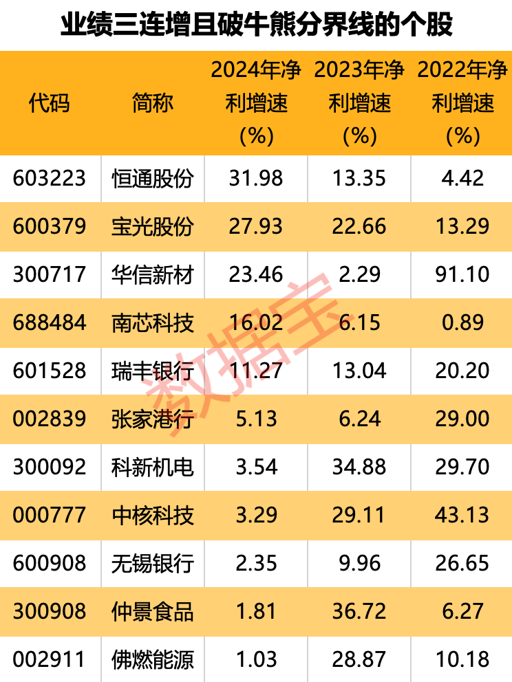 据数据宝统计,在昨日股价突破牛熊分界线且目前已披露2024年年报或快报的A股公司中,有11股2022年—2024年连续三年归母净利润均保持增长,其中恒通股份、宝光股份、华信新材2024年归母净利润增速居前。