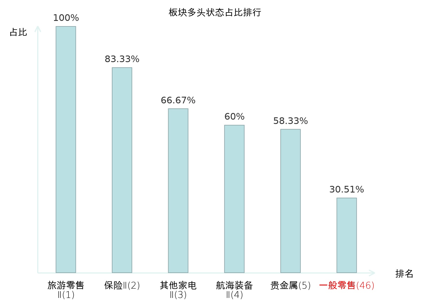全市场所有行业板块中主力多头状态占比排名中,旅游零售Ⅱ板块位居第一。综合Ⅱ板块名次提升最快,较昨日上升69位。