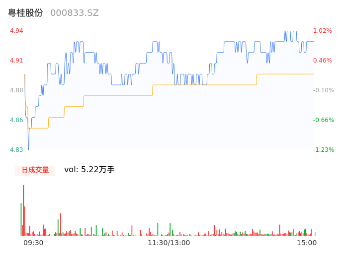 09月09日,粤桂股份收报4.93,股价涨幅0.82%,成交金额2557.17万,换手率1.15%。