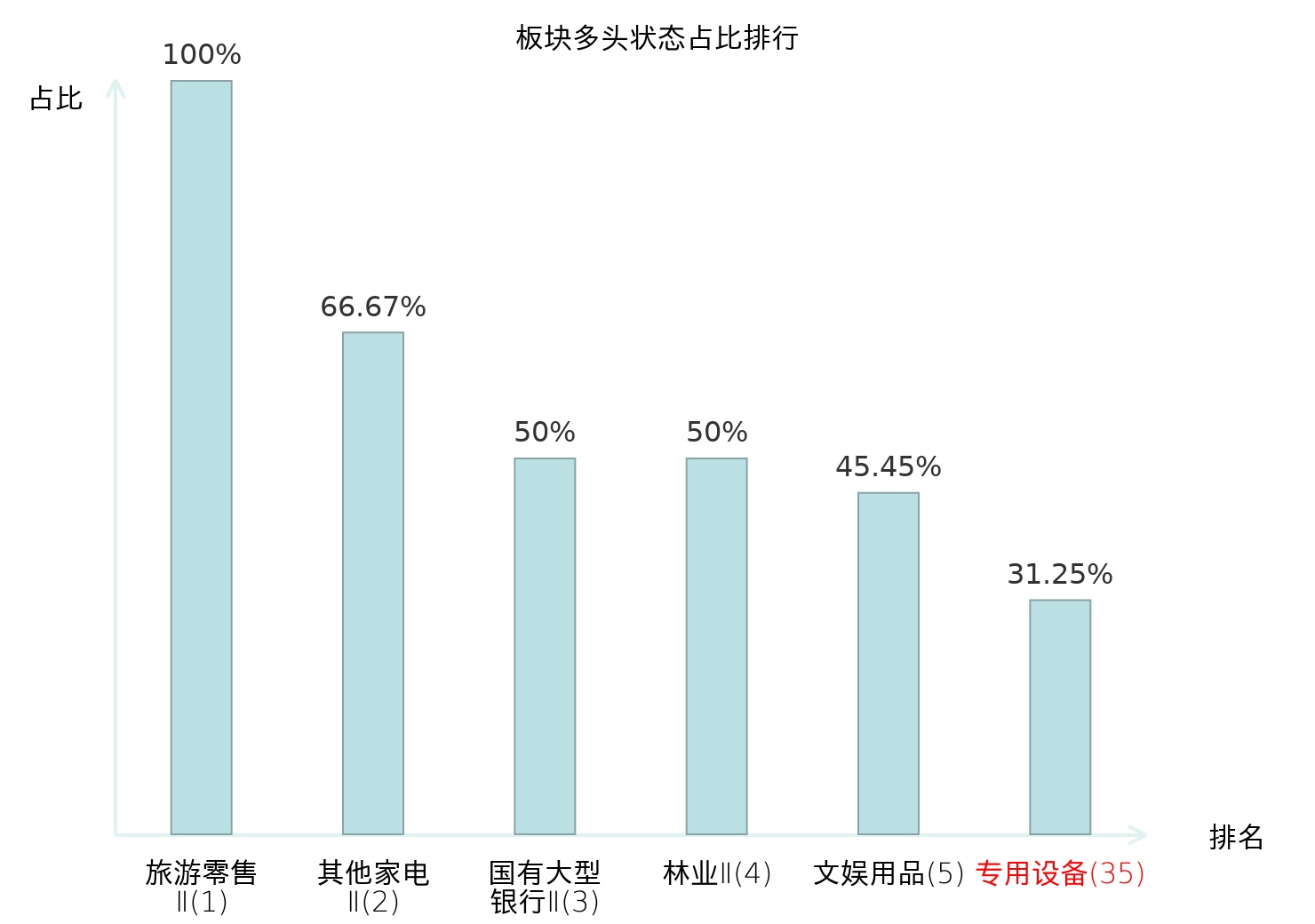 全市场所有行业板块中主力多头状态占比排名中,旅游零售Ⅱ板块位居第一。农业综合Ⅱ板块名次提升最快,较昨日上升102位。