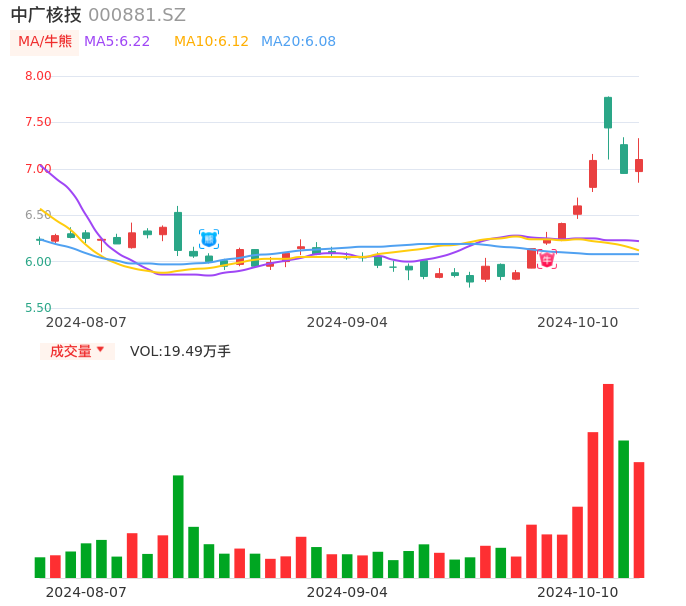 10月10日,中广核技收报7.10,股价涨幅2.16%,成交金额1.39亿,换手率2.47%。