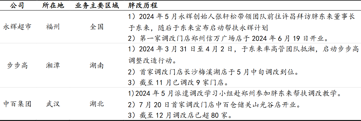 步步高及中百集团同步开启学习胖东来进程。除永辉超市外,步步高、中百集团及于上半年展开学习胖东来调改进程,其中步步高、永辉超市和胖东来共享上游供应链,并直接引入胖东来品牌产品,中百集团则共享胖东来供应链信息,并充分发挥自身集聚湖北的区域优势,在已有供应链的基础上不断优化。