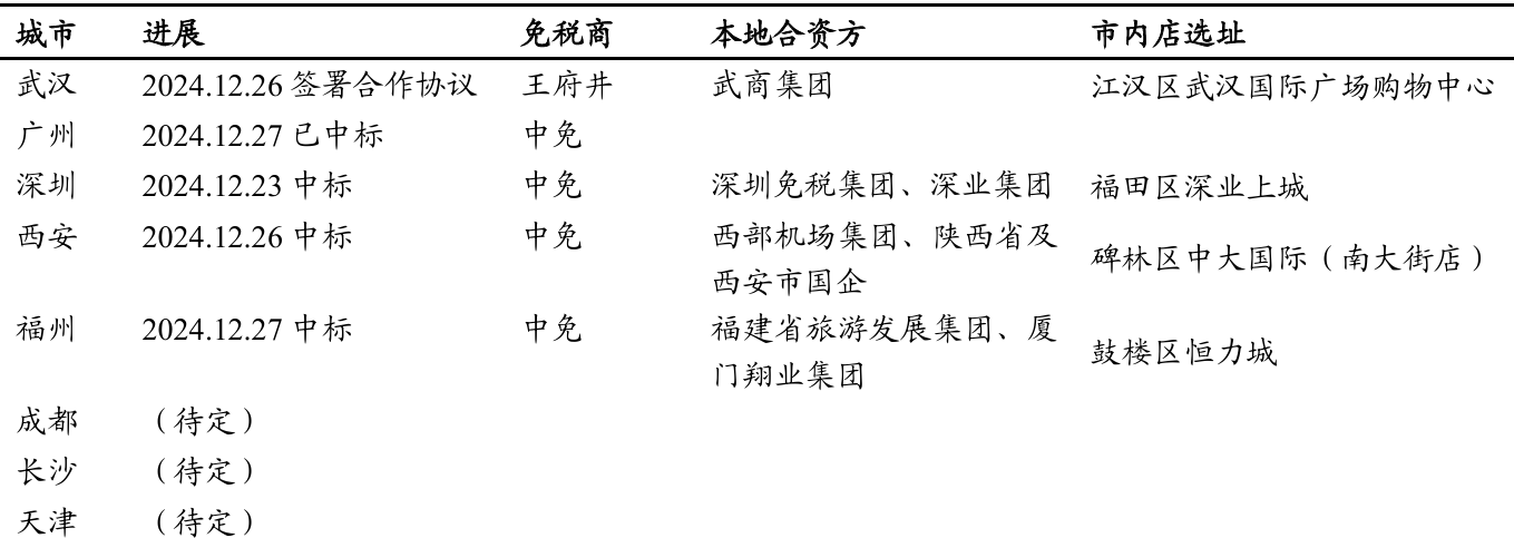 2024年12月起,新设8家市内免税店项目陆续发布中标结果或合作协议。截至2025年1月1日,王府井已与武商集团针对武汉市项目签署投资合作协议、成立合资公司,中免集团陆续中标广州、深圳、西安和福州4个市内免税店项目,仍有成都、长沙和天津项目的免税商中标结果未公布。