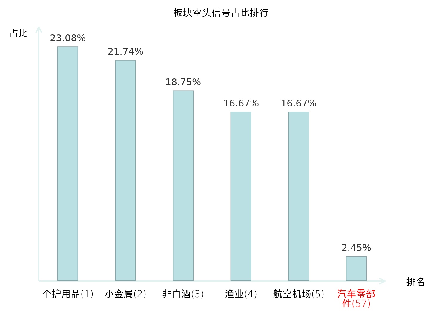 全市场所有行业板块中主力空头信号占比排名中,个护用品板块位居第一。轨交设备Ⅱ板块名次提升最快,较昨日上升106位。