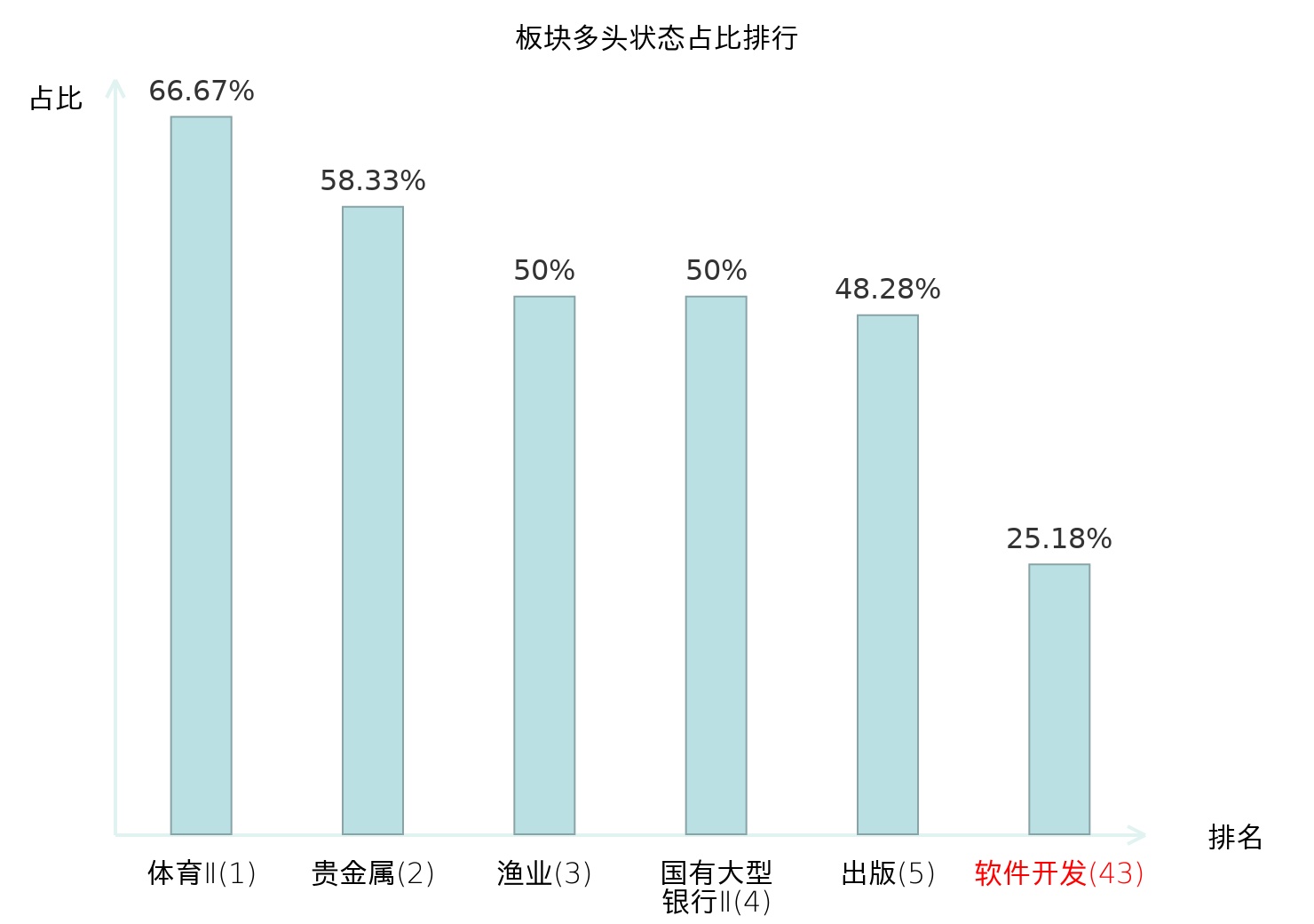 全市场所有行业板块中主力多头状态占比排名中,体育Ⅱ板块位居第一。医药商业板块名次提升最快,较昨日上升69位。