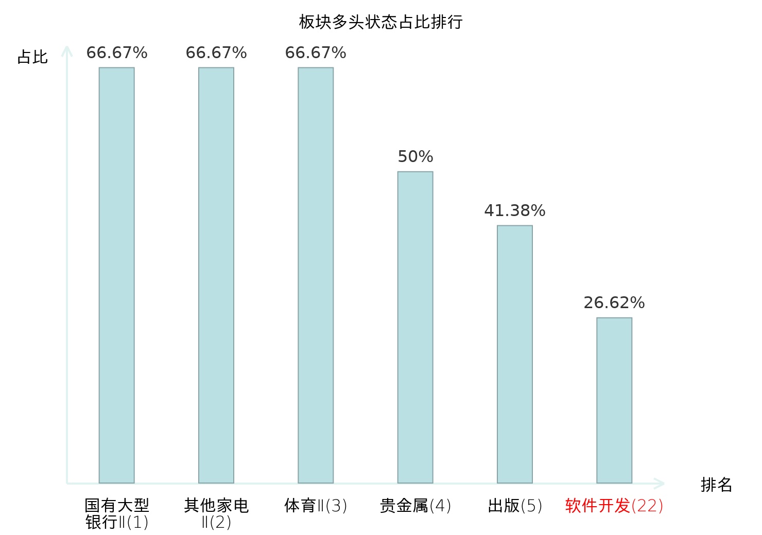 全市场所有行业板块中主力多头状态占比排名中,国有大型银行Ⅱ板块位居第一。林业Ⅱ板块名次提升最快,较昨日上升96位。