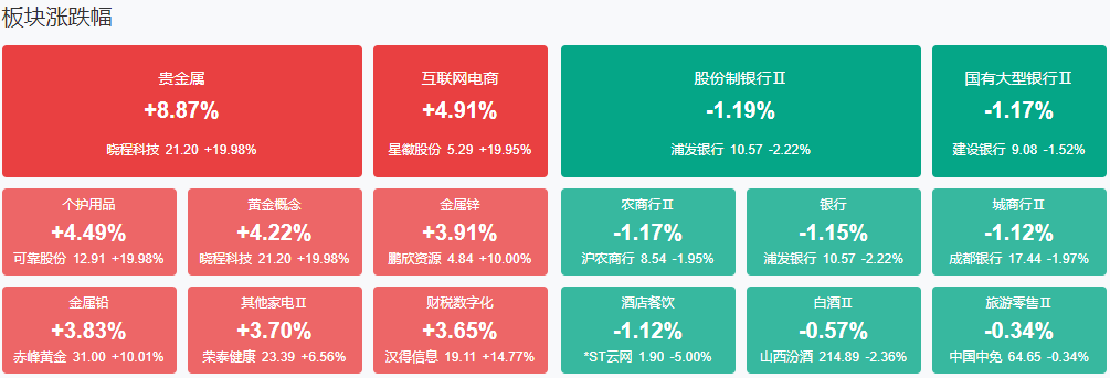 板块方面,黄金、电商、机器人、影视等板块涨幅居前,银行、白酒、港口等板块跌幅居前。截至收盘,沪指涨0.45%,深成指涨1.27%,创业板指涨1.59%。