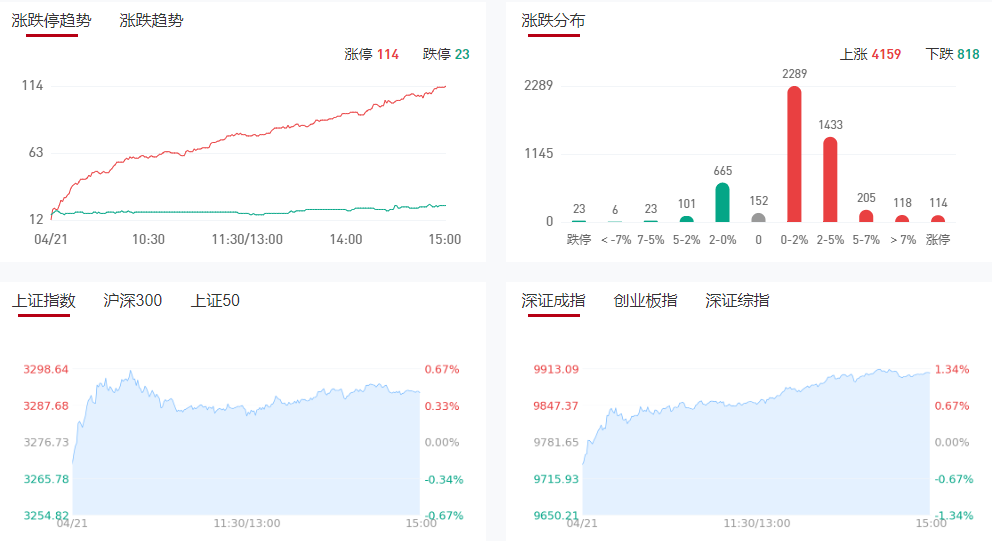 市场全天低开后震荡反弹,创业板指领涨,沪深两市全天成交额1.04万亿,较上个交易日放量1267亿。盘面上,市场热点快速轮动,个股涨多跌少,全市场超4300只个股上涨。从板块来看,黄金股集体大涨,四川黄金等10余股涨停。大消费股再度活跃,电商、影视等方向领涨,国芳集团等多股涨停。机器人概念股展开反弹,京城股份涨停。