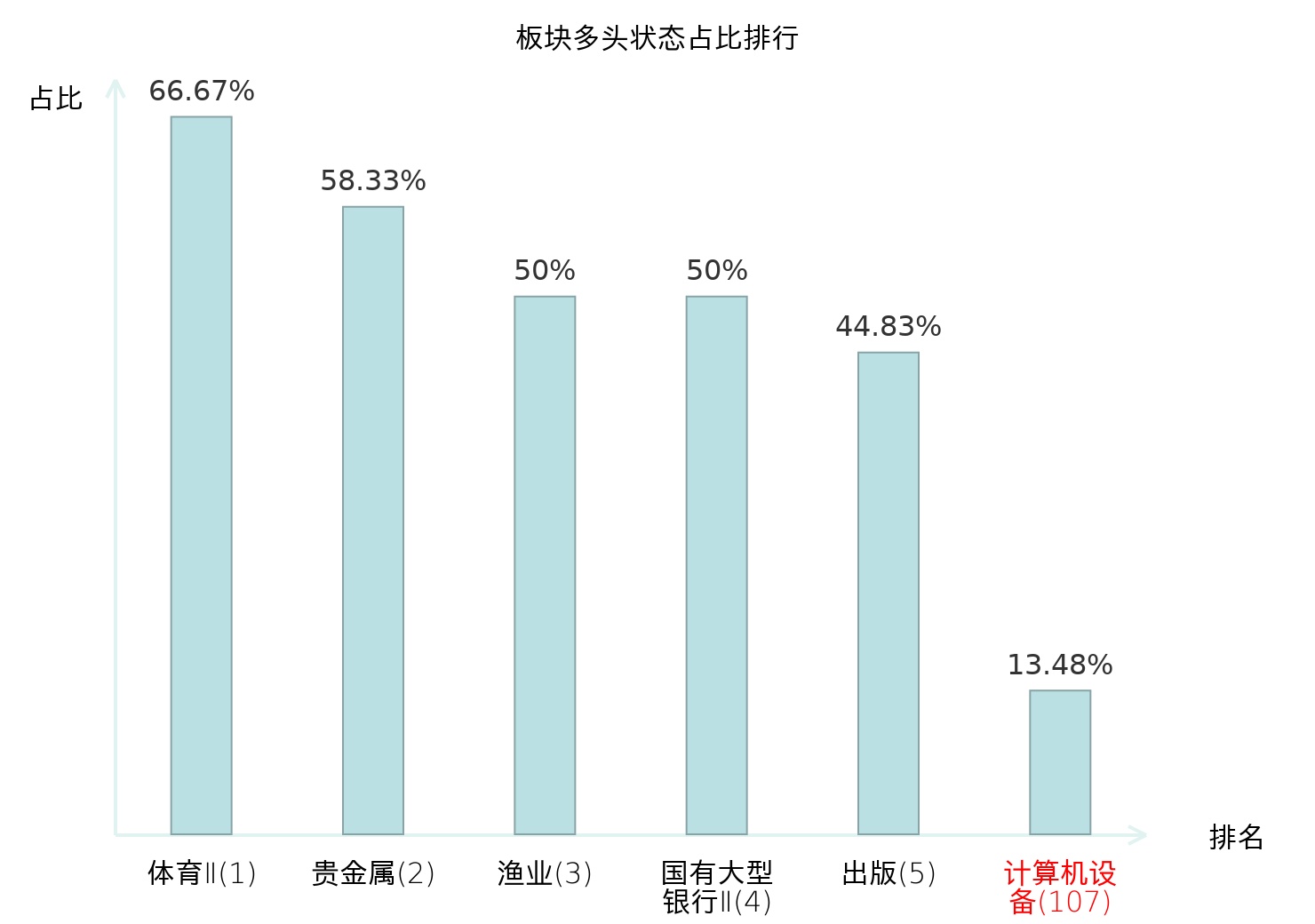 全市场所有行业板块中主力多头状态占比排名中,体育Ⅱ板块位居第一。农业综合Ⅱ板块名次提升最快,较昨日上升113位。