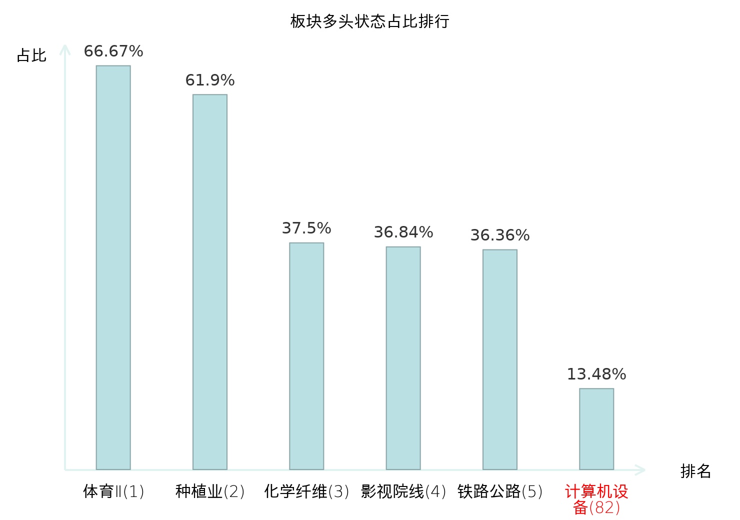 全市场所有行业板块中主力多头状态占比排名中,体育Ⅱ板块位居第一。种植业板块名次提升最快,较昨日上升65位。