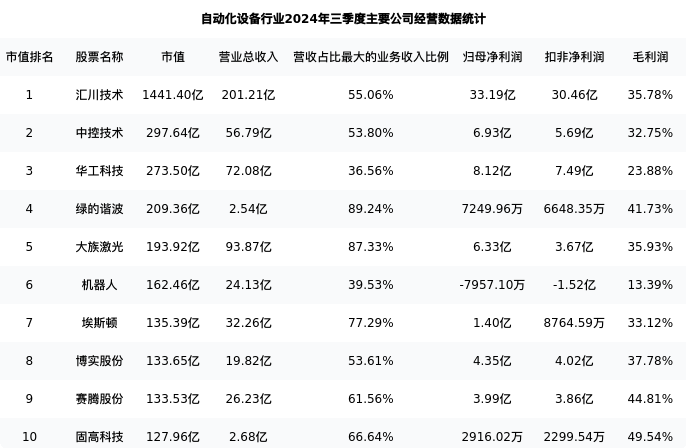 华工科技最新报告期数据为三季度,下表汇总了自动化设备行业内市值靠前的公司三季度主要经营数据
