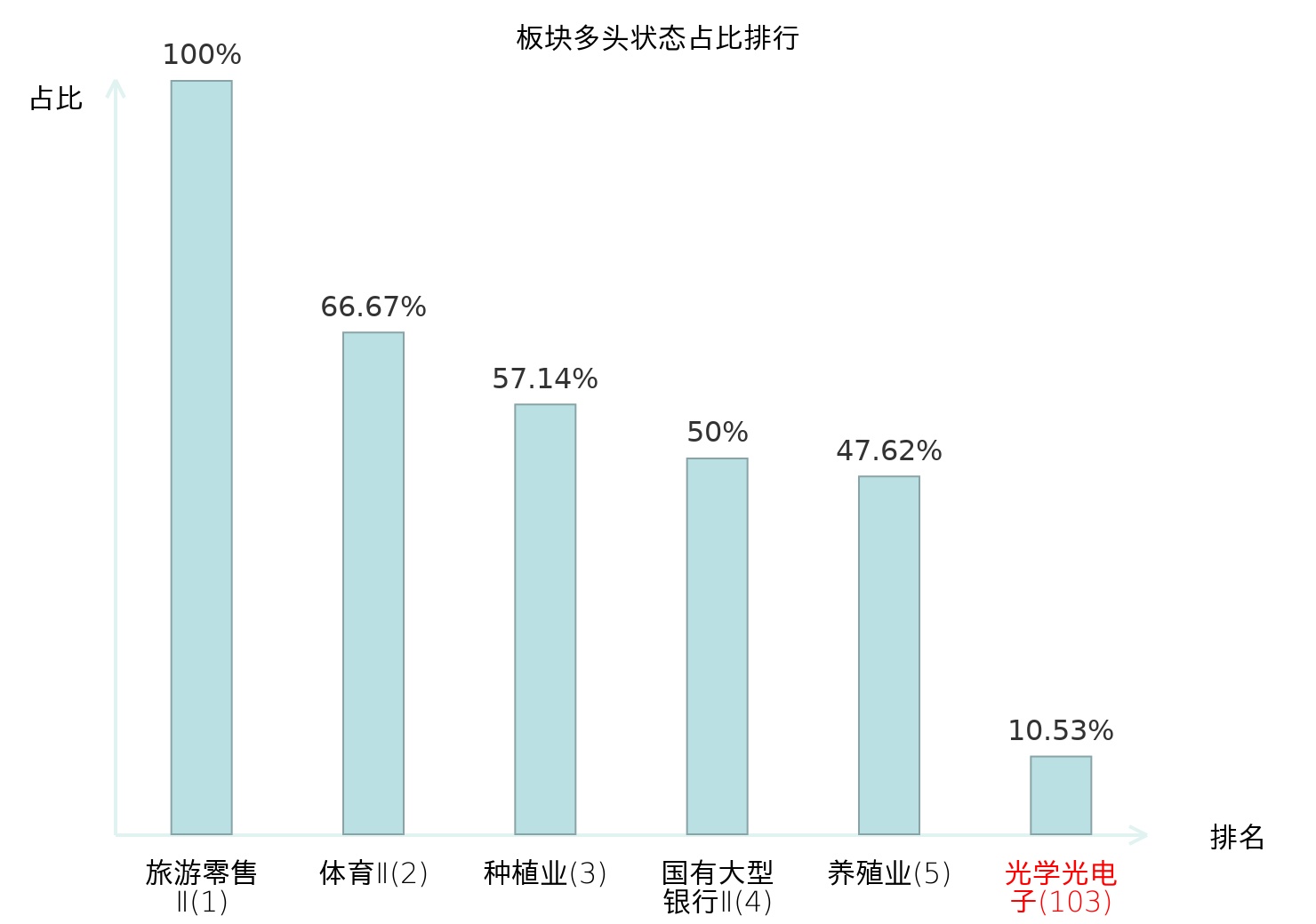 全市场所有行业板块中主力多头状态占比排名中,旅游零售Ⅱ板块位居第一。互联网电商板块名次提升最快,较昨日上升89位。