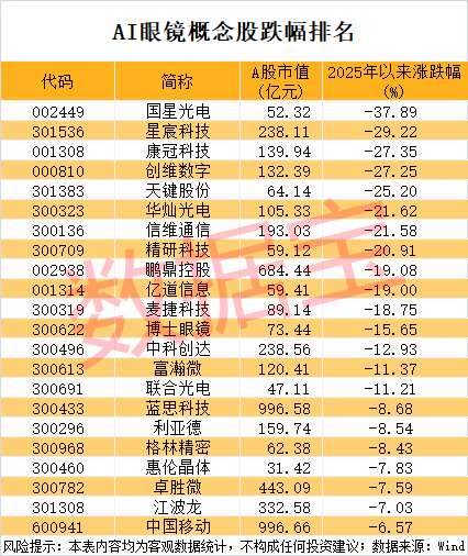 二级市场表现方面,截至4月14日收盘,AI眼镜概念股今年以来平均下跌10.19%,大幅跑输同期上证指数。国星光电、星宸科技、康冠科技、创维数字等8只概念股累计跌幅超20%。