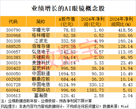 业绩数据方面,根据年报、业绩快报、预告净利润下限计算(无下限则取公告数值),2024年净利润同比增长的AI眼镜概念股有13只,其中江波龙、佰维存储、弘信电子净利润扭亏为盈。