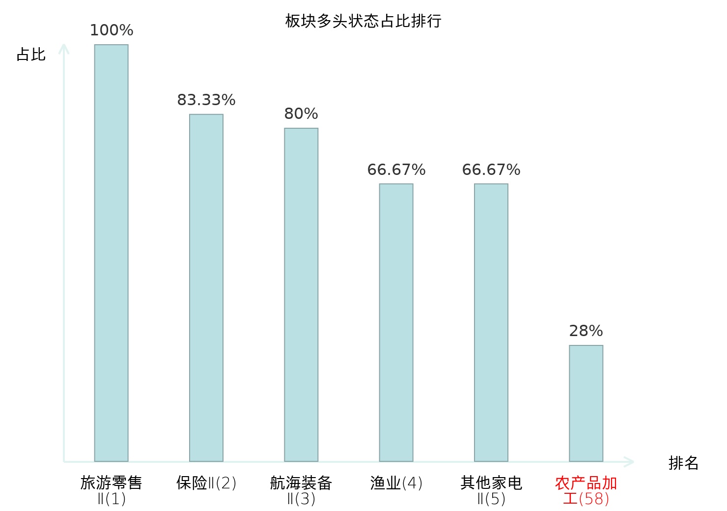 全市场所有行业板块中主力多头状态占比排名中,旅游零售Ⅱ板块位居第一。证券Ⅱ板块名次提升最快,较昨日上升106位。