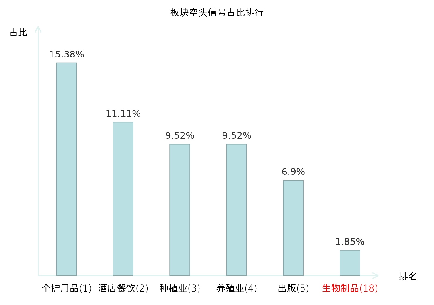 全市场所有行业板块中主力空头信号占比排名中,个护用品板块位居第一。环境治理板块名次提升最快,较昨日上升107位。
