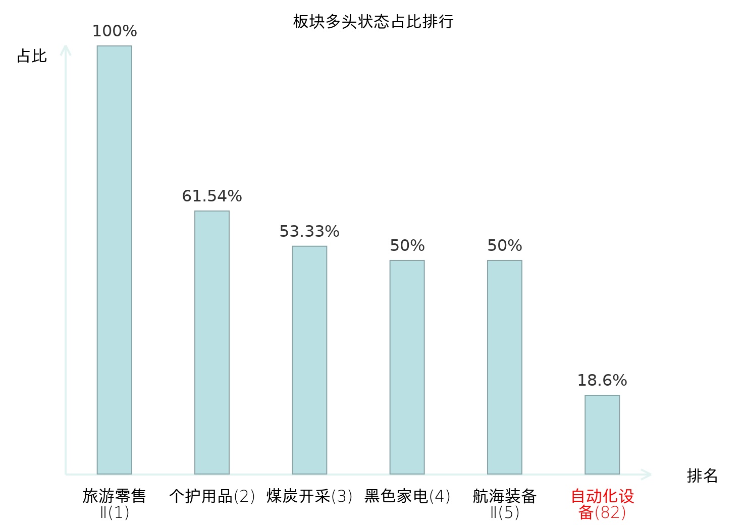 全市场所有行业板块中主力多头状态占比排名中,旅游零售Ⅱ板块位居第一。医疗美容板块名次提升最快,较昨日上升80位。