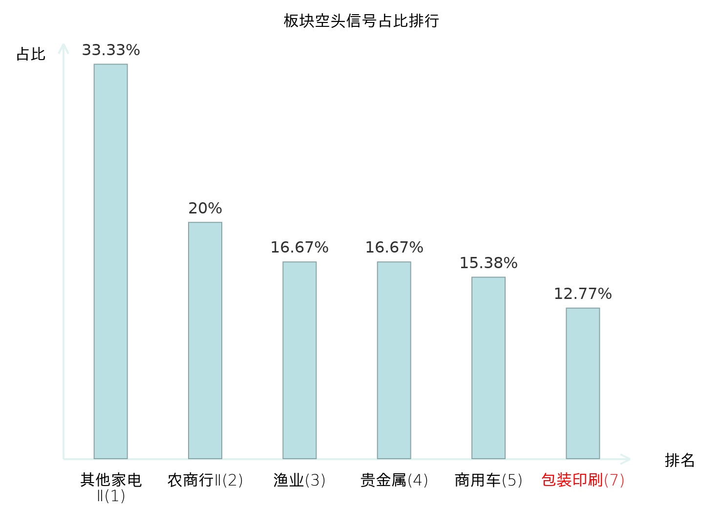 全市场所有行业板块中主力空头信号占比排名中,其他家电Ⅱ板块位居第一。医疗器械板块名次提升最快,较昨日上升119位。