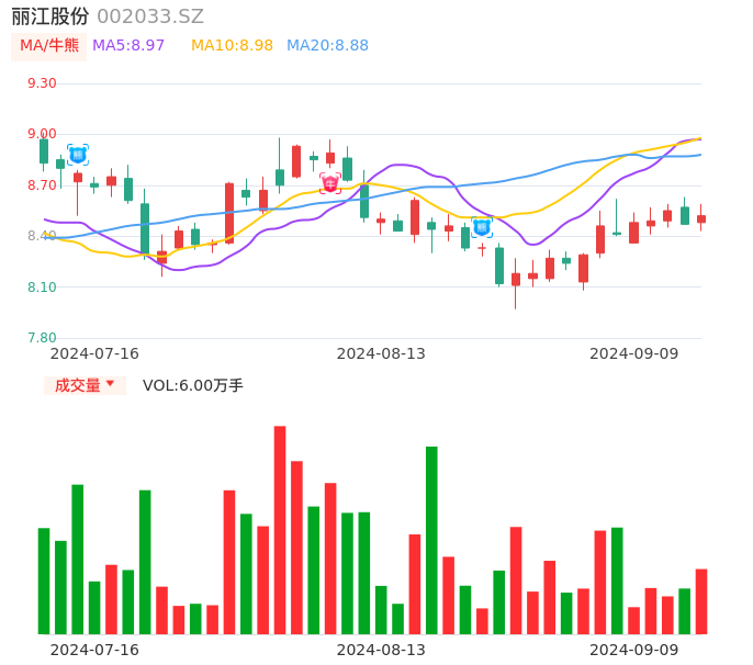 09月09日,丽江股份收报8.52,股价涨幅0.59%,成交金额5107.84万,换手率1.09%。