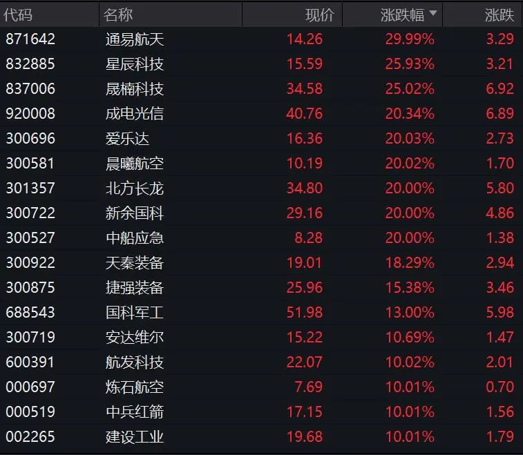 军工电子、航天装备、航空装备、航海装备等也大幅走高,通易航天开盘仅约3分钟就垂直30%涨停,晨曦航空、中船应急等近10股20cm封板,内蒙一机、中国海防等批量涨停。