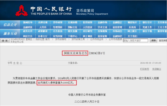 ►8月30日周五盘后央行公告,2024年8月人民银行开展了公开市场国债买卖操作,向部分公开市场业务一级交易商买入短期限国债并卖出长期限国债,全月净买入债券面值为1000亿元。有分析指出,从今年开始,国内印钞方式将逐步过渡到央行买国债。通过央行买国债,增量的基础货币将直达财政,支撑经济发展。机构认为,央行净买入1000亿国债的规模,从流动性角度来看即投放1000亿中长期流动性,在不降准的背景下,客观上起到补充中长期流动性的效果。如果央行将国债操作纳入常规工具箱,将有助于平滑货币政策操作、加强财政和货币政策协调、以及推动市场的长期发展。
