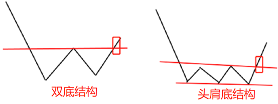 也就是说日K以上级别的V形反转几乎是很罕见的,通常后双底、头肩底底部形态比较常见,往往在脱离先前的下降趋势之后会采取横向复杂摆动的方式运动。