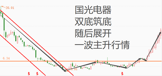 国光电器2018年10月底经过连续极端阴线快速下杀之后,开始脱离了原有的下降通道开始构筑双底结构,随后经过了一段时间的震荡之后在2019年9月突破颈线位回踩后展开一波主升行情。