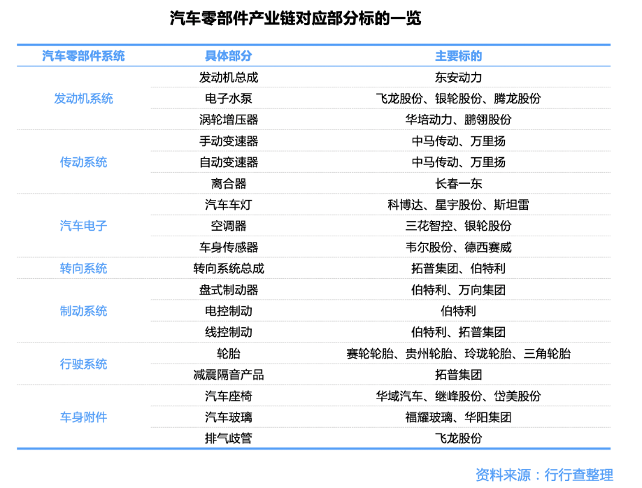 国内汽车零部件各个子环节都涌现出一批优质的代表性企业。动力总成系统中的东安动力、潍柴动力、精锻科技、飞龙股份等;传动系统万里扬、中马传动和长春东等;汽车电子环节的科博达、星宇股份、三花智控、银轮股份和德赛西威等;底盘系统中的拓普集团等;电器设备中的均胜电子;内外饰系统中的华域汽车、福耀玻璃、岱美股份和华阳集团等。汽车零部件产业链对应部分标的一览: