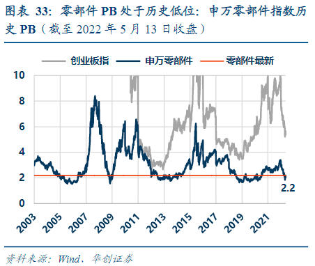加之,过去两年,汽车零部件以及整车毛利率皆受原材料涨价负面影响,且毛利率的下降几乎都是由材料价格上涨而带来的。反过来,利润率的恢复又有可观弹性——无论零部件向下游转移压力,还是原材料价格回落,这带来了当前零部件板块PE处于历史中枢而PB位于历史底部的局面。